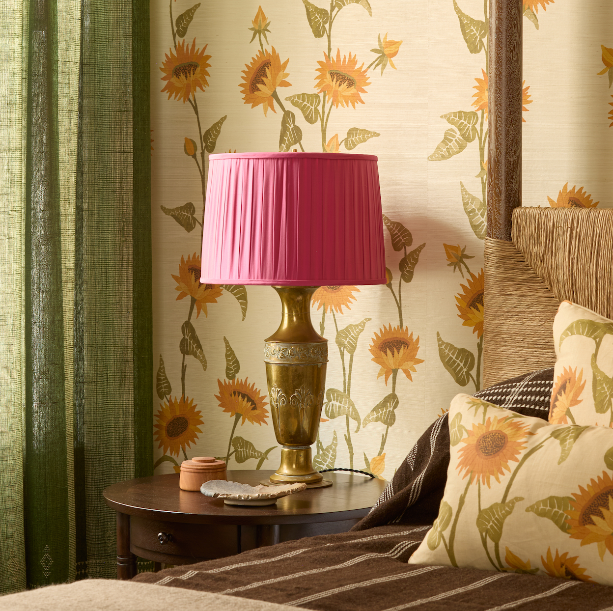 A bedroom covered in peter Dunham fig leaf pattern - on the walls and a matching lampshade. the headboard is green with a vintage pillow and gray bedspread.