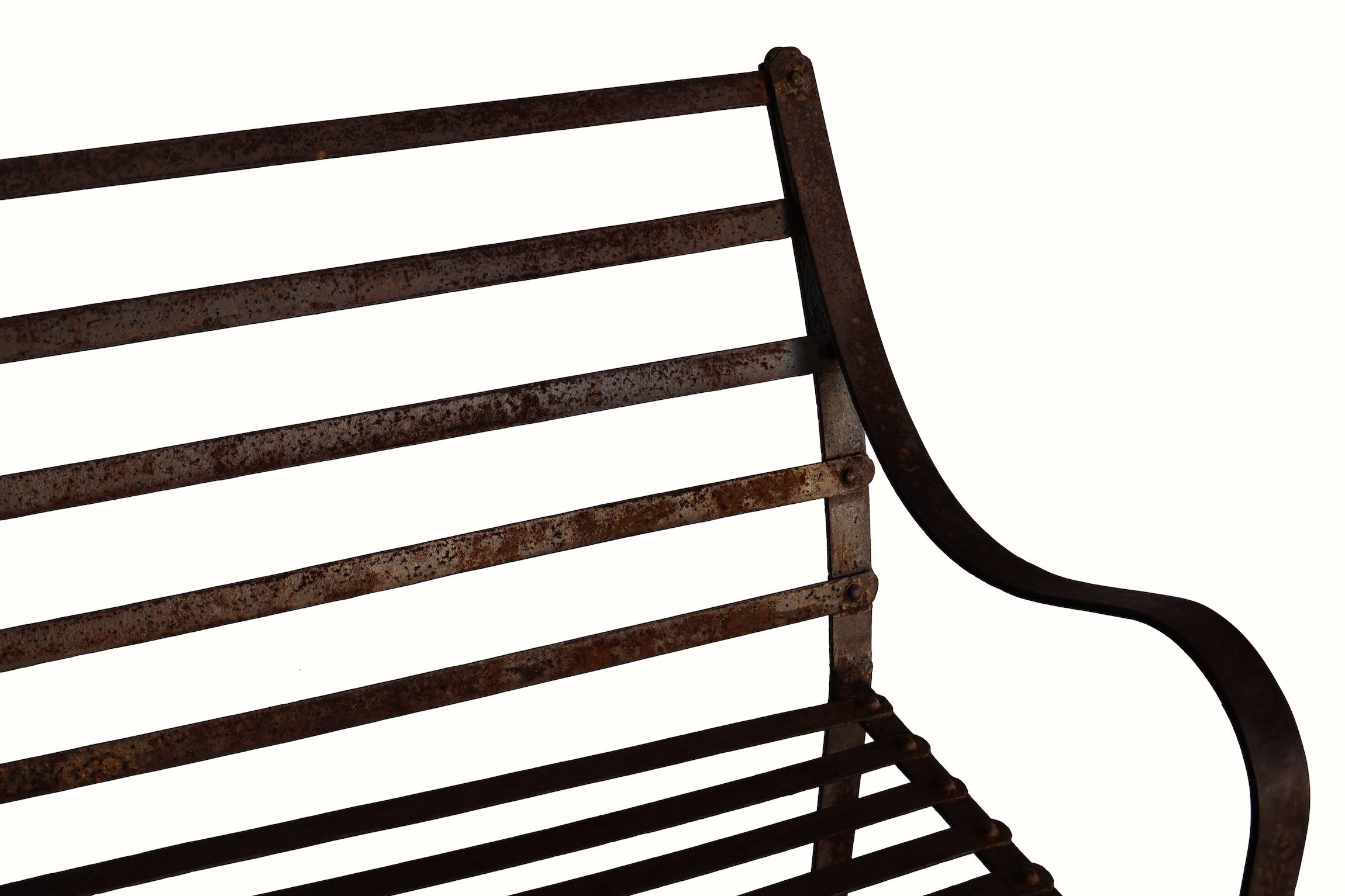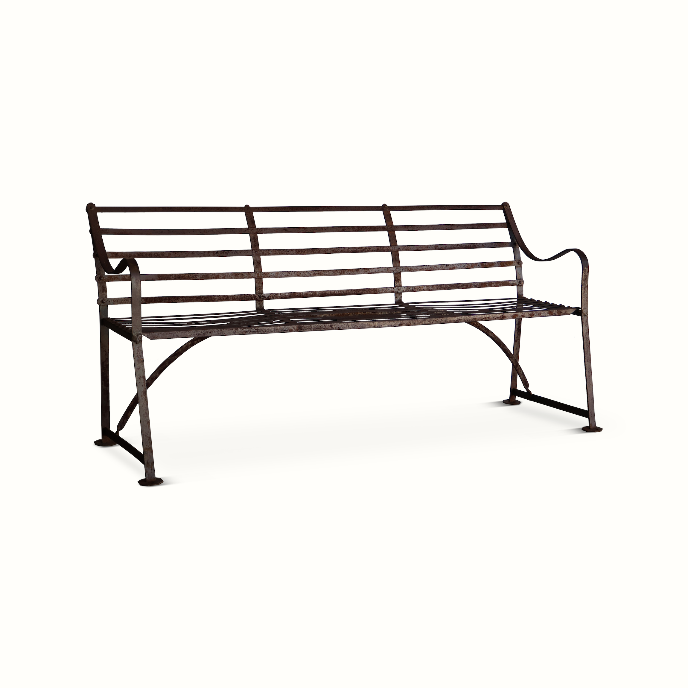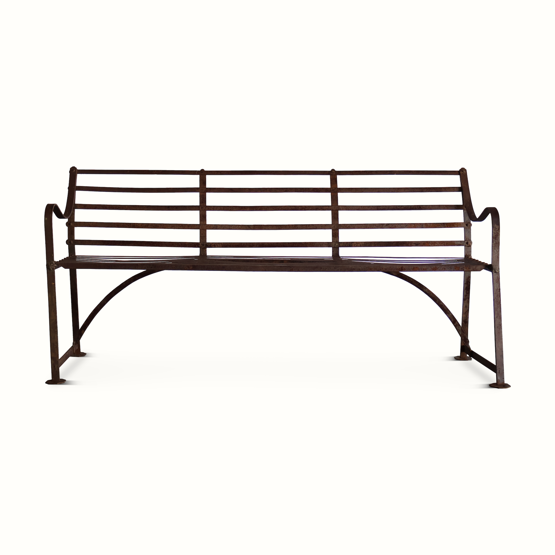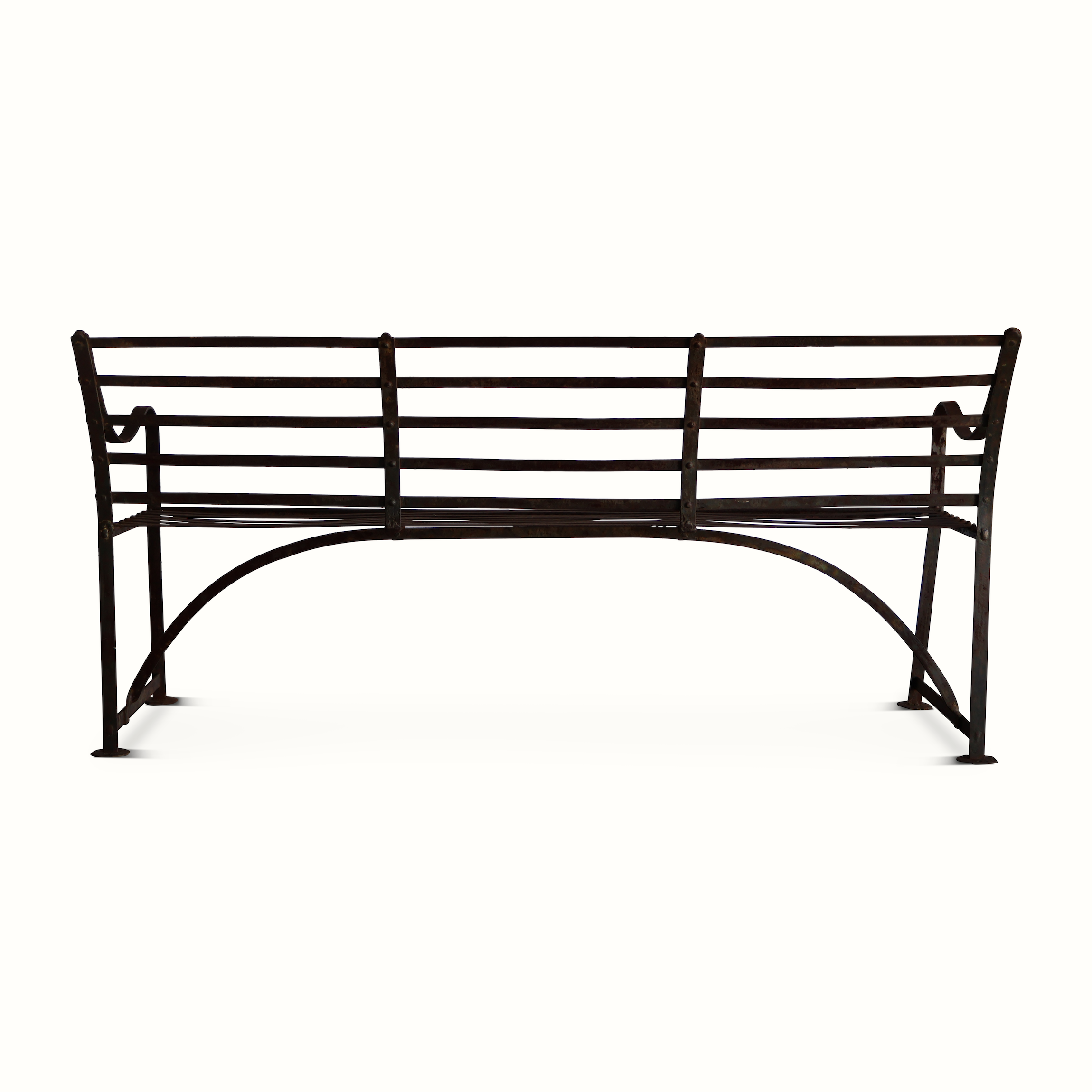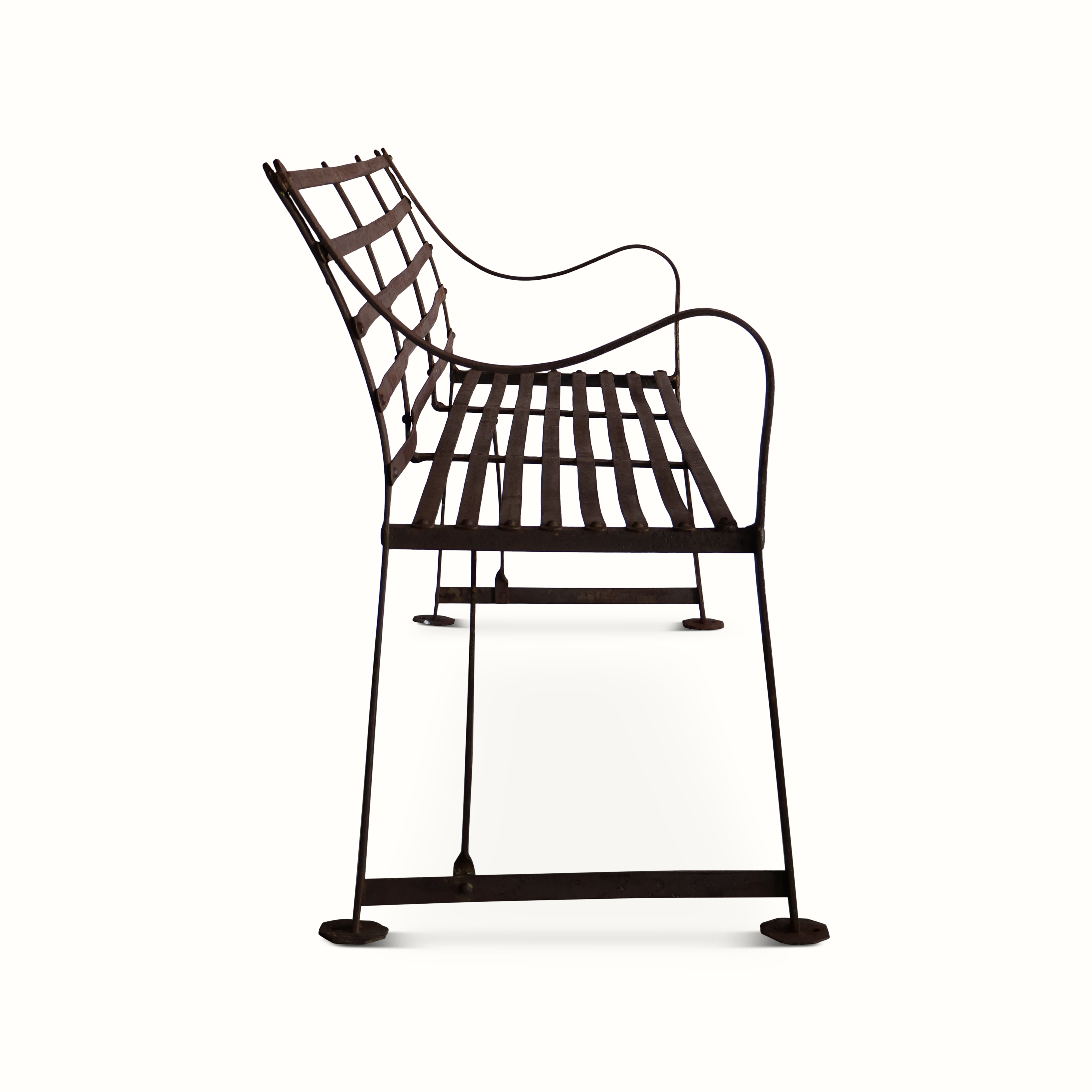 An antique iron garden bench from early 20th century England.