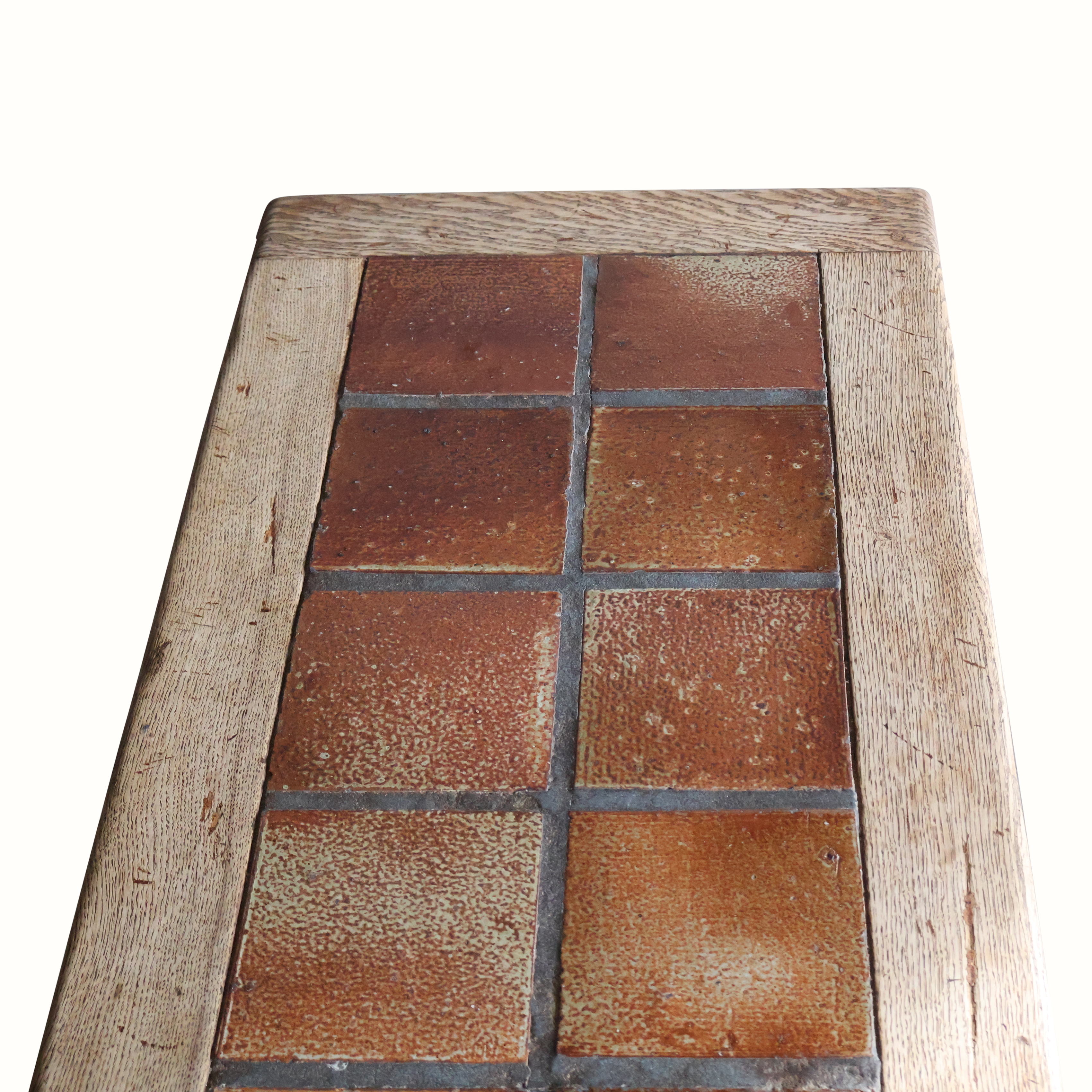 A forged iron and oak coffee table with ceramic tile inset top. In good original condition.