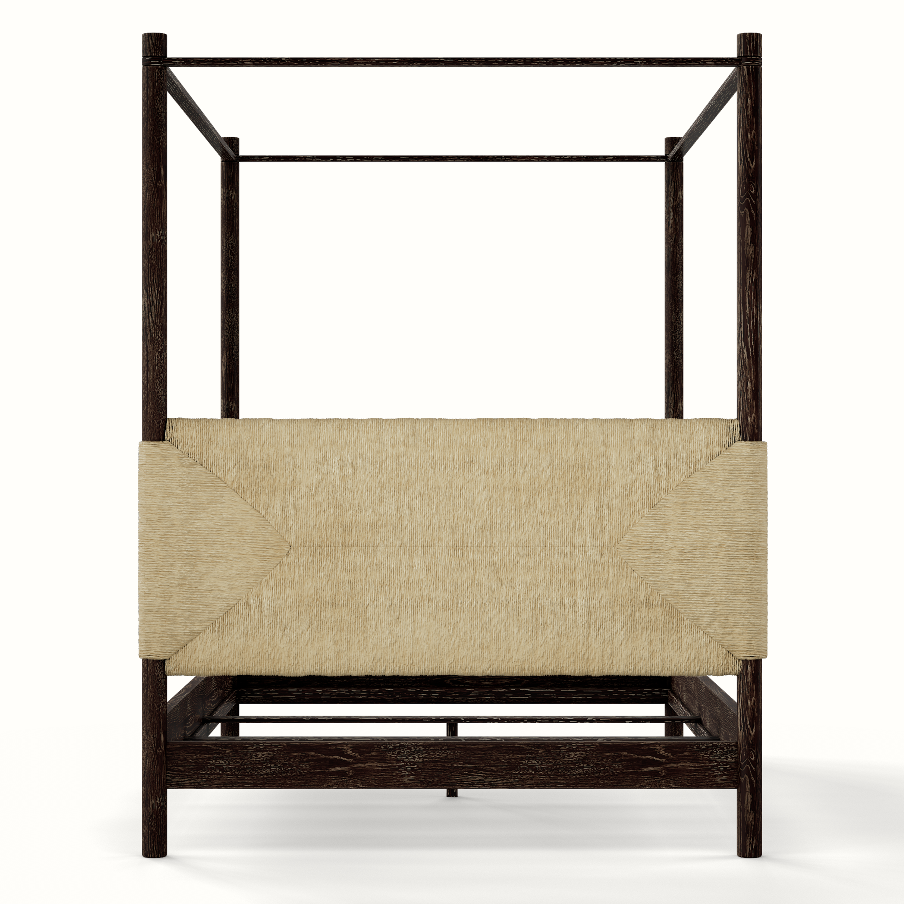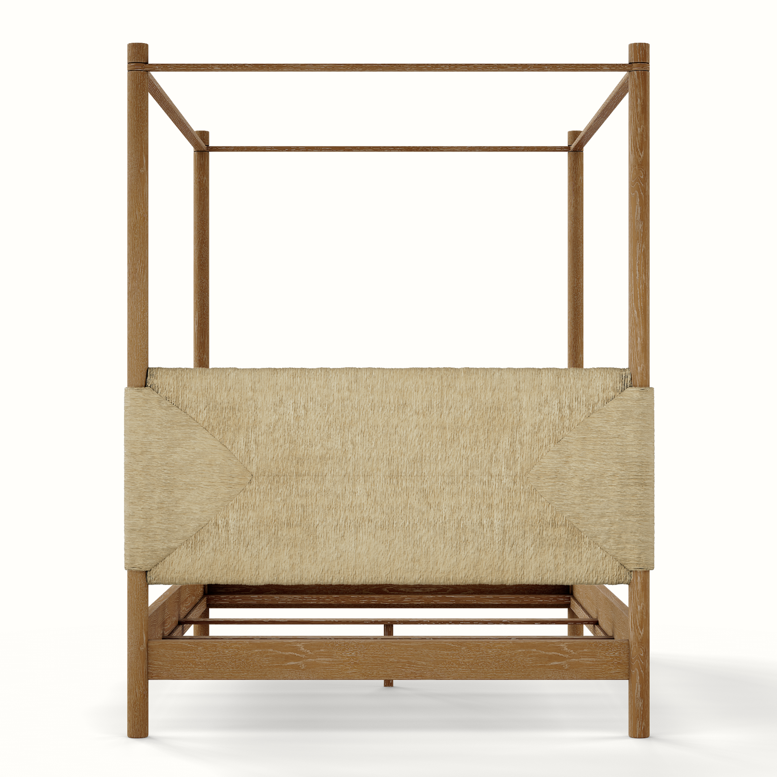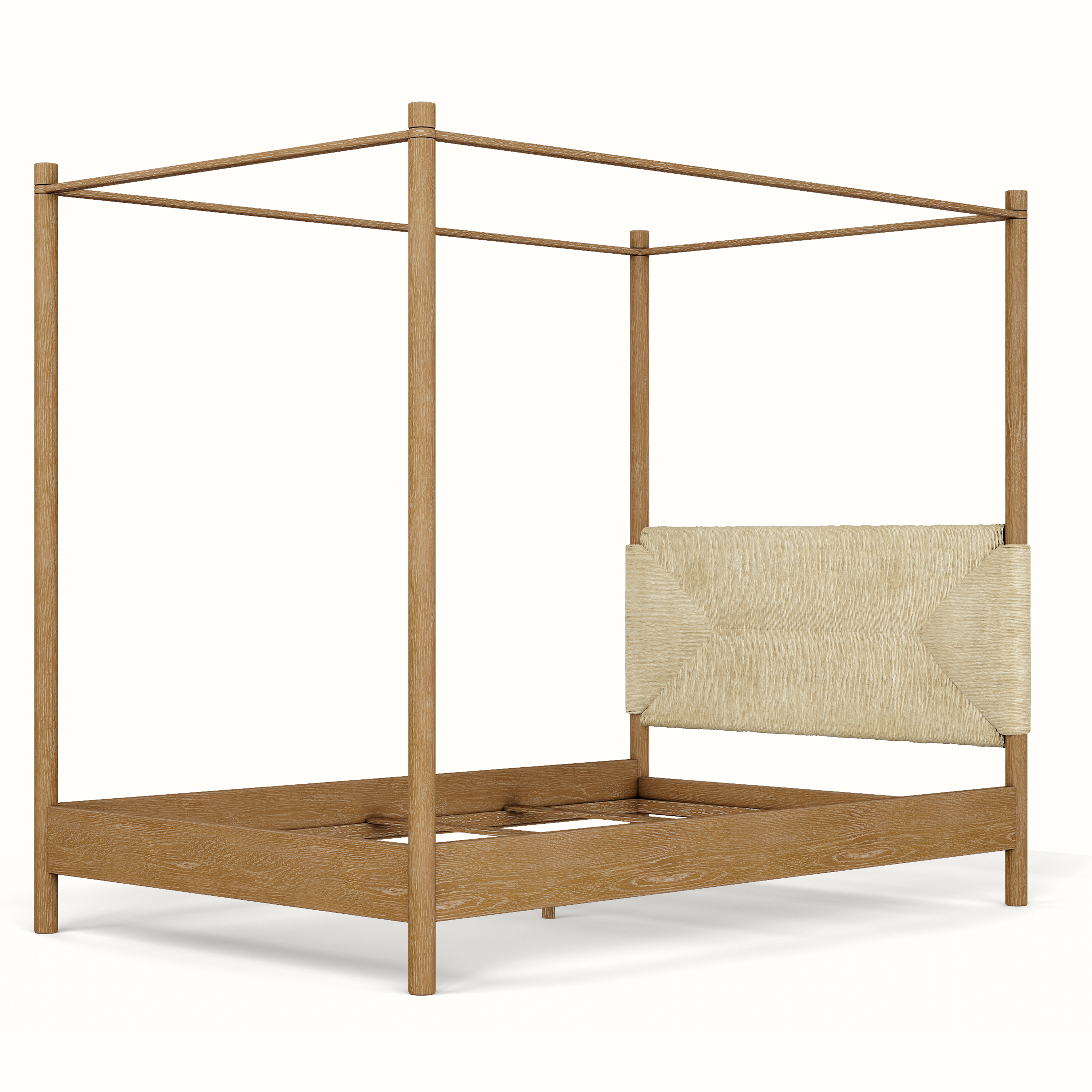 Our beautiful Perriand 4 Poster Bed is handmade in Los Angeles with a handwoven rush headboard and foot board and a solid oak frame. The Perriand 4 Poster anchors a bedroom with texture and style. Available as a Queen, King, and California King.